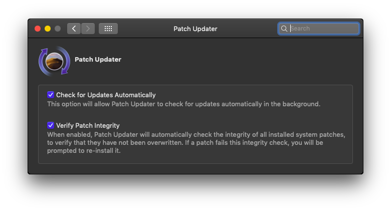 Just finished implementing a new Patch Updater feature! Now, Patch Updater has the ability to check the integrity of patches installed on your machine, allowing it to detect cases where system patches get overwritten (such as during a software update, etc.) When such a case occurs, it will alert you and prompt you to re-install the affected patches automatically. The new Patch Updater version is, of course, available as an update through previous Patch Updater versions. Also, both this new patch integrity check feature, and automatic update checking, can be disabled via the new System Preferences item.