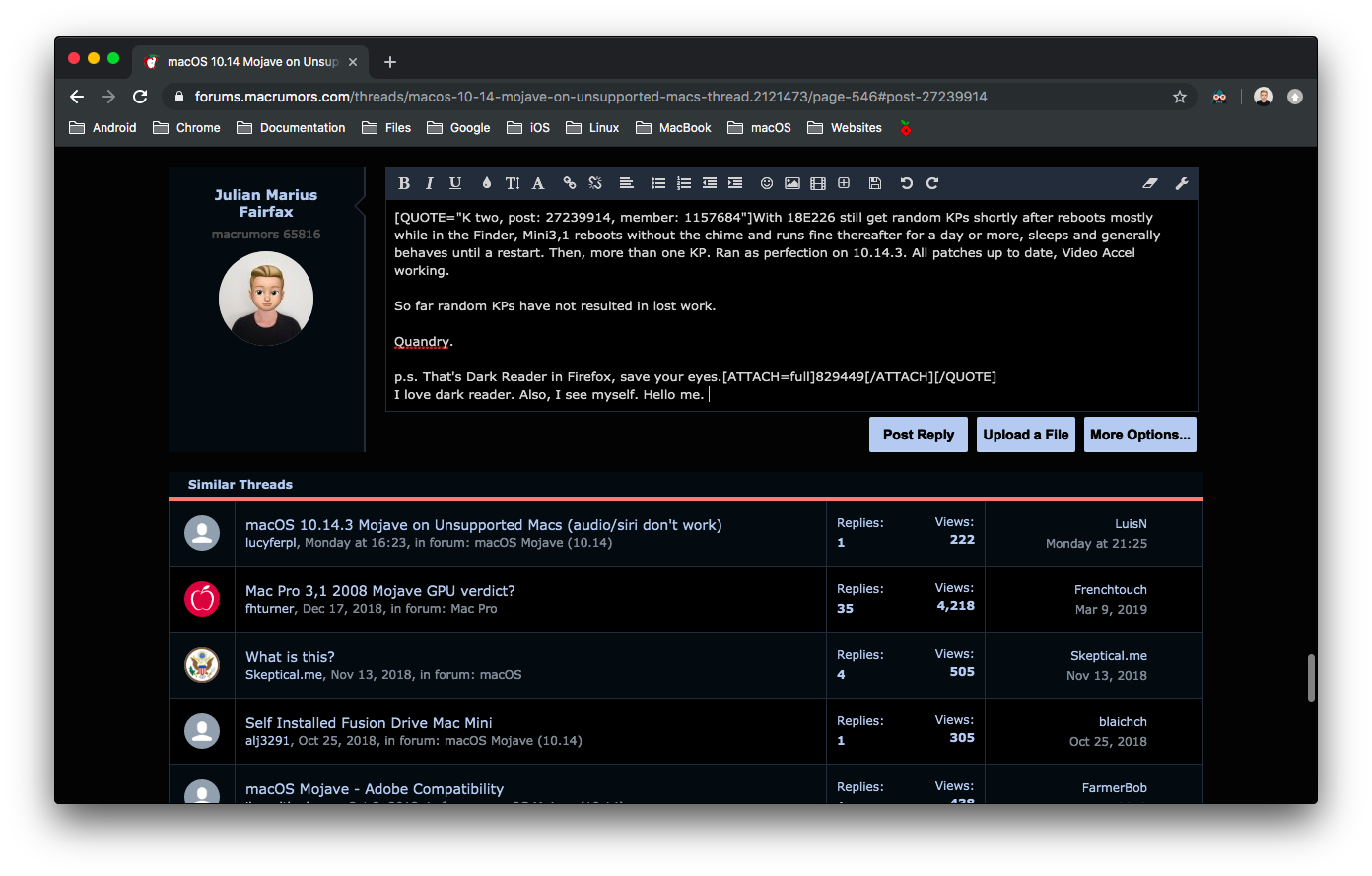 I love dark reader. Also, I see myself. Hello me.With 18E226 still get random KPs shortly after reboots mostly while in the Finder, Mini3,1 reboots without the chime and runs fine thereafter for a day or more, sleeps and generally behaves until a restart. Then, more than one KP. Ran as perfection on 10.14.3. All patches up to date, Video Accel working.