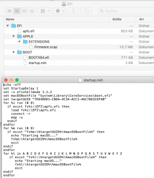 Found some shell script in the Volume EFI, looks like it could be the place where the Post Install Patcher changed something for non native APFS Macs.