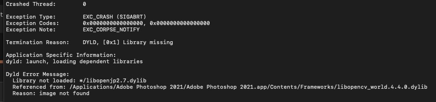 Remove Photoshop and previous installed dylib, reinstall Photoshop and follow my instructions.Finally I found the dylib from another source and installed them as suggested by lumps but no success. Photoshop 2021 still crashing in start with this error log. I tried also to include the last three dylib directly in the Frameworks but same result and same error logView attachment 1659766