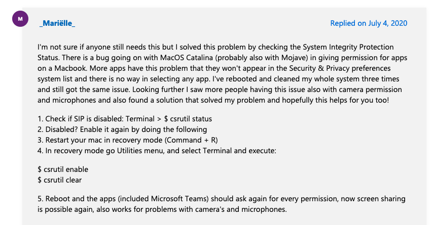 Found my solution (post# 9732). Thank you to @GrimMethos. I was wondering which of these privileges needs to be selected to allow Teams to also generate notifications (such as the response to a message). Would it be 'PostEvent'?Hello everyone. Discovered another issue on my fresh install of 10.15.7 running H114 security update. Seems applications like Teams or Skype isn't able to access my camera. Looking in Security and Privacy, I don't see any app requests to use those devices. Facetime on the other hand works fine with the camera. I've reinstalled Teams and rebooted but it just doesn't want to ask for permission. Am I missing some setting in Catalina? I'm wondering if having SIP off is somehow breaking certain apps being able to request access to things like cameras, etc?
