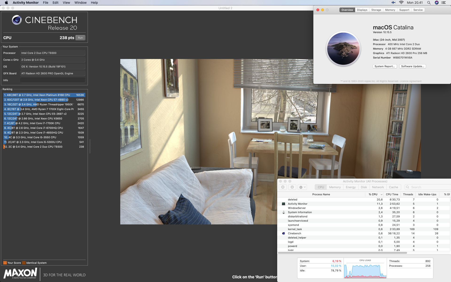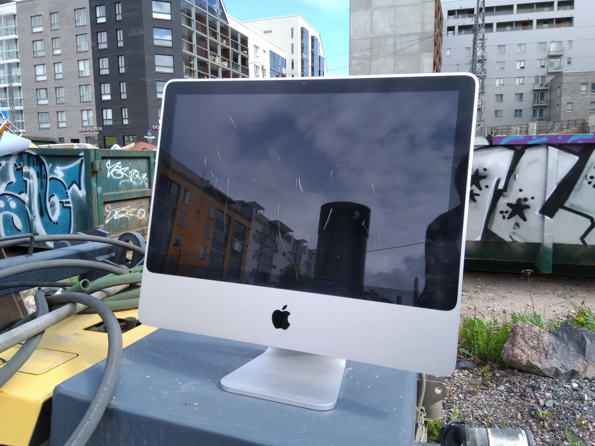 The 20 inch iMac was the top model with a 2.4 GHz CPU and a Radeon HD 2600 Pro. Unfortunately the dumpster had scratched the glass. Instead of searching for a replacement glass I bought a 24 inch iMac with a failing GPU for 30 euros. The plan was to swap the good GPU from the 20 inch iMac to the 24 inch iMac.