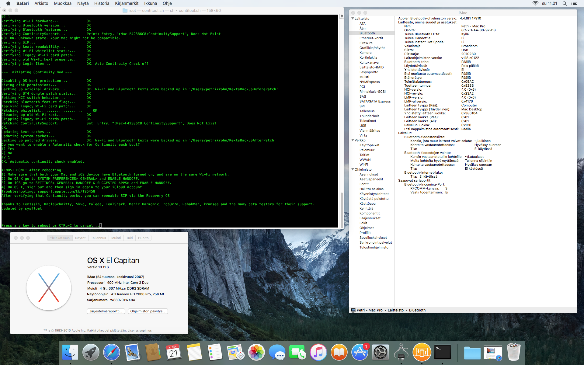 At first the Bluetooth function on BCM94331CD card did not show up on the System Profiler. After I removed the original BT card it showed up. I then ran Continuity Activation Tool on El Capitan to check that everything worked. I had trouble securing the BCM94331CD card as the only screw hole on the adapter was on the wrong side. I ended up securing a bag sealer to the single stud, hoping that the bezel would put additional pressure on the card.