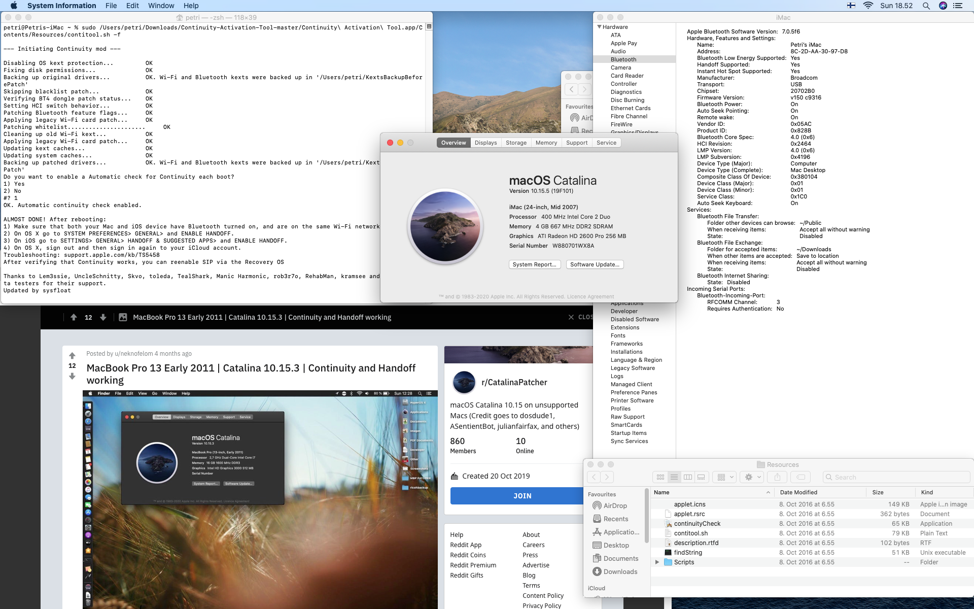 On Catalina I tried to run Continuity Activation tool again. The script failed to start. I then followed instructions I found on Reddit: I opened the package contents and ran the included script file directly from the terminal. System Preferences under "General" now shows that "Handoff" is available and activated.
