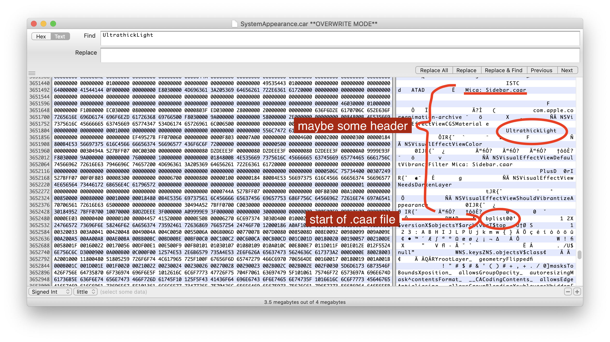 It is some information ahead of the caar file itself. Even ThemeEngine doesn't show this information as far as I remember. And if you export the caar file, of course this additional header is not included. It is also clear, that if you swap the whole .car(!) file with the one from DarkMode it works almost properly (excluding text rendering), as inside the DarkMode .car file this header refers to UltrathickDark for example, instead of UltrathickLight. Also taking a .car file from older macOS versions shouldn't work at all or at least could not fix the broken areas because as we have seen earlier the old "headers" refer to the old descriptions for example Ultralight (no ..Light or ..Dark at the end).