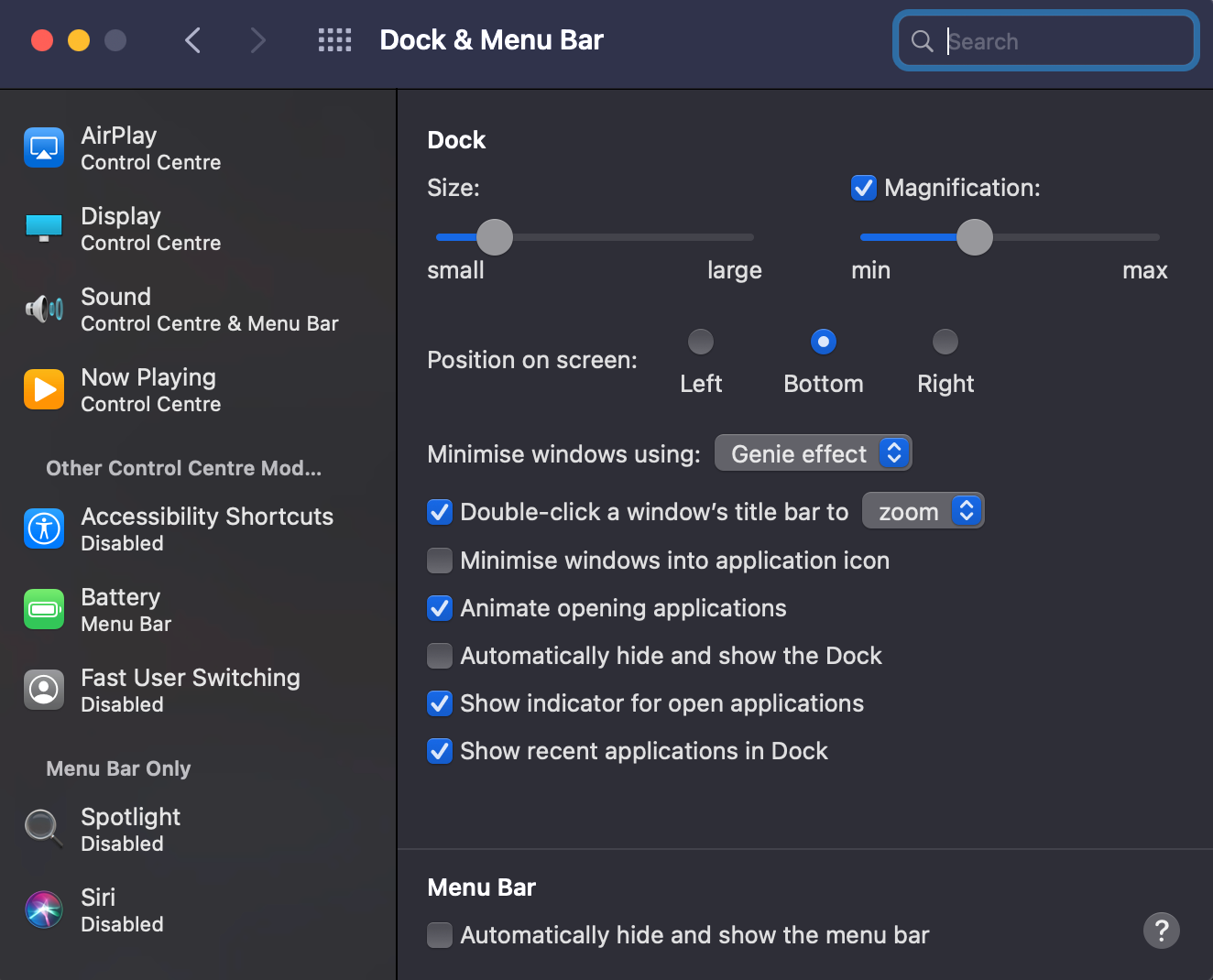 What's annoying is that Spotlight in that menu shows as disabled, for the Menu Bar, but is still there. I've reported it, but still.....