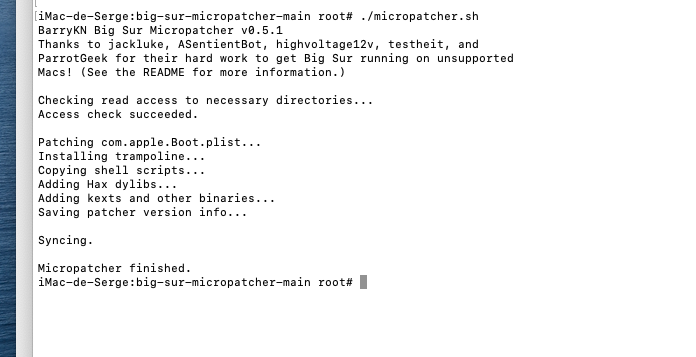 7) After a while, you will see a classic configuration screen appear (language, CGU, etc.). After answering these questions, there is still a patch to launch (Ethernet and WIFI are not available elsewhere before this last patch). You must therefore restart on the micropatcher key and then launch a terminal to launch the last patch command which will install kernel extensions: