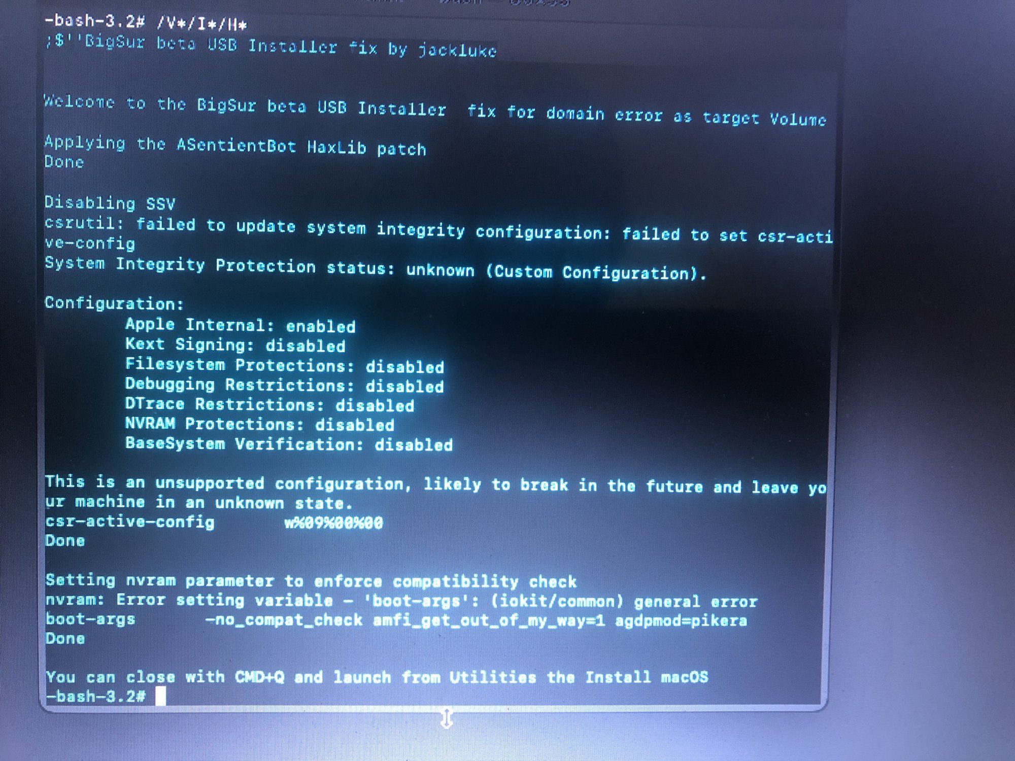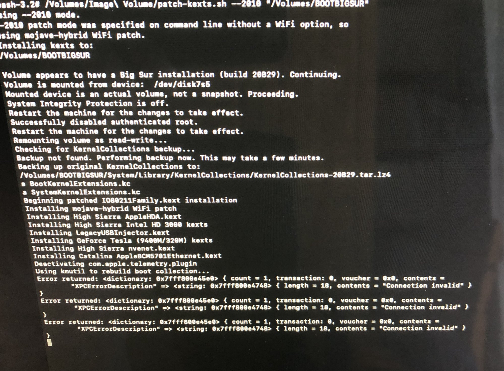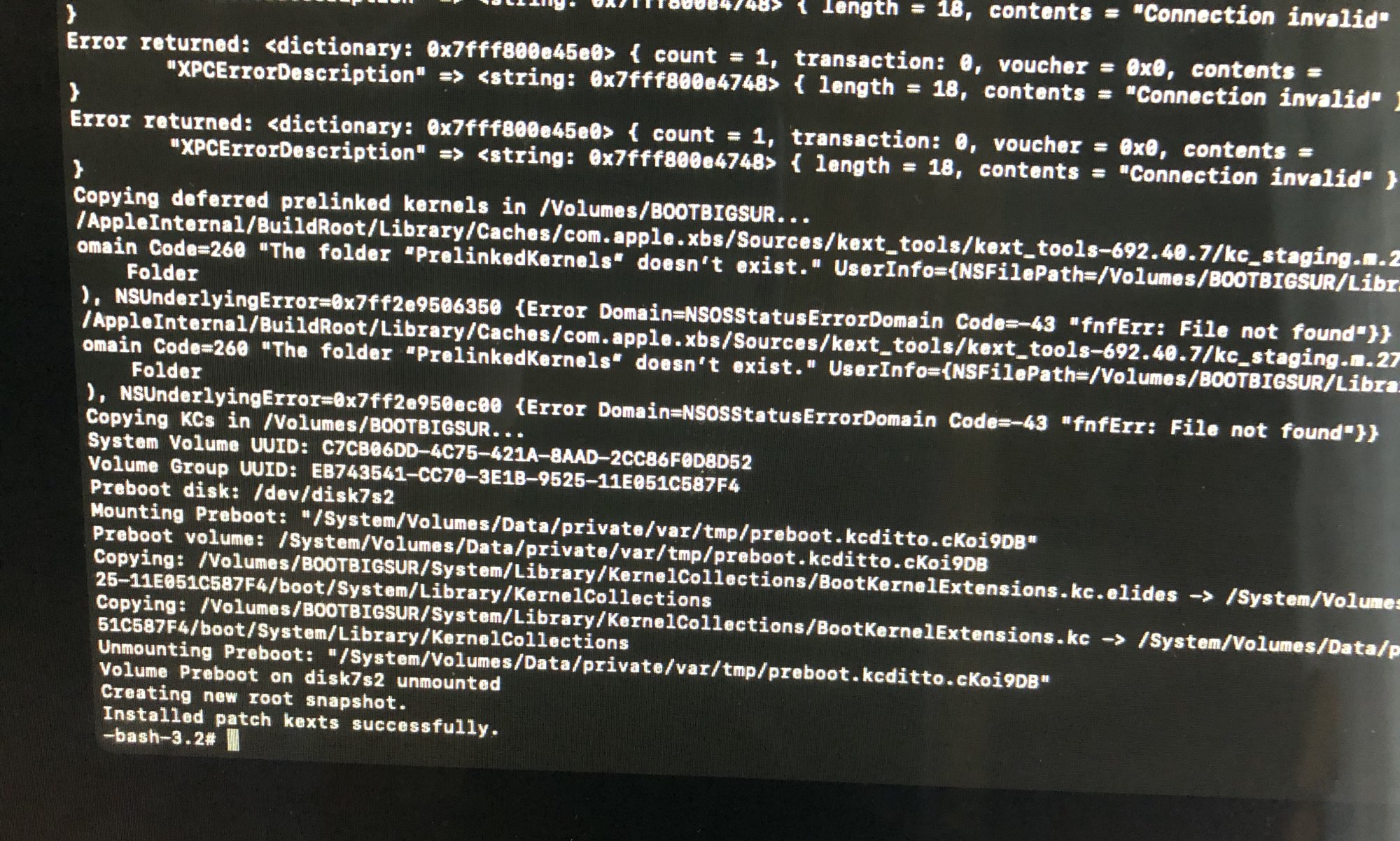 There are some errors but at the end it says "Installed patch kexts successfully". I will try to find out the meaning of these errors anyway. Someone had a idea ?