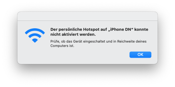 I can see the hotspot in my WiFi status. If I select it, I can see, that the hotspot is activated on my iPhone. The switch toggles instantly and WiFi switches to LTE. But then I get a message on my iMac that the personal hotspot could not be activated.