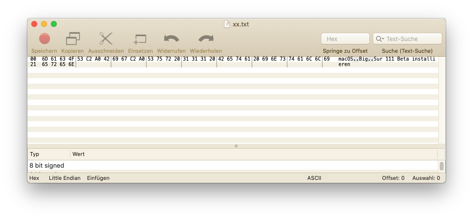 - the file name of macOS Big Sur Beta installieren.app looks as if there were two blanks in the string "macOS Big Sur "while there is in fact two times the sequence hex C2 A0, maybe only in the file name generated in my German setup