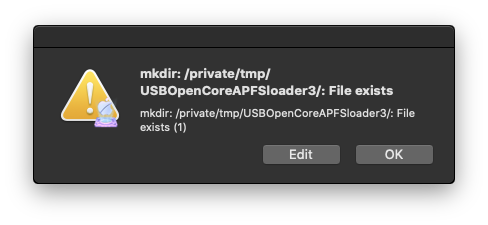To fix the "mkdir" error, open /private/tmp/ and delete the "USBOpenCoreAPFSloader3" temporary folder, then retry to remake an usb opencore bootloader, after you made, reboot holding alt-option key and select it from apple startup manager.