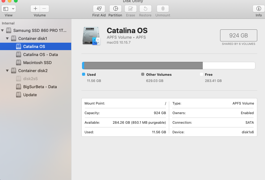 Samsung SSD EVO 860 1 TB — two partitions: 1st has Catalina and Mojave OSs installed, 2nd has Big Sur.