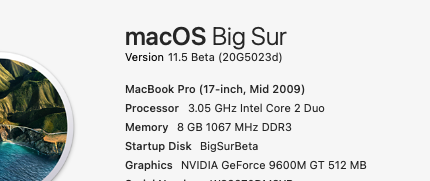 Also here MBP5,2 is running fine with 11.5b1.Successful Installation of Big Sur 11.5 beta1 on 17” MacBook Pro 5,2 (mid 2009), SSD.