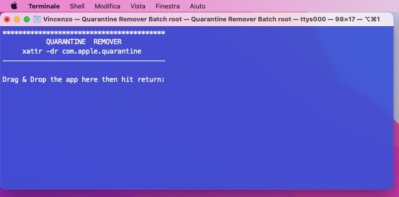 The Tool is also very useful to remove the Quarantine from many unsigned file, downloaded and inserted in a single folder. TO USE IT, just run my "Quarantine Remover Batch root" with a double click. The Terminal starts up and then just follow the instructions that say to drag into Terminal the folder containing everything from which you want to remove the Quarantine. Then, to press Enter and enter the Administrator password. Enjoy.