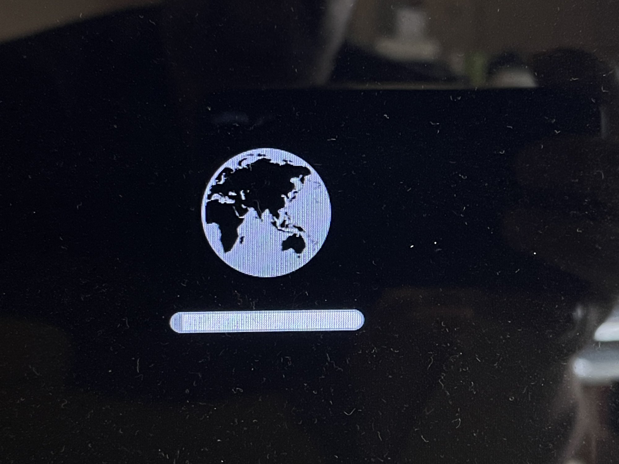 What happens on the bootup is the progress bar will get a little over halfway full before going to a black screen with a pinwheel that will spin on/off for three seconds at a time and an unmovable cursor in the top left corner.