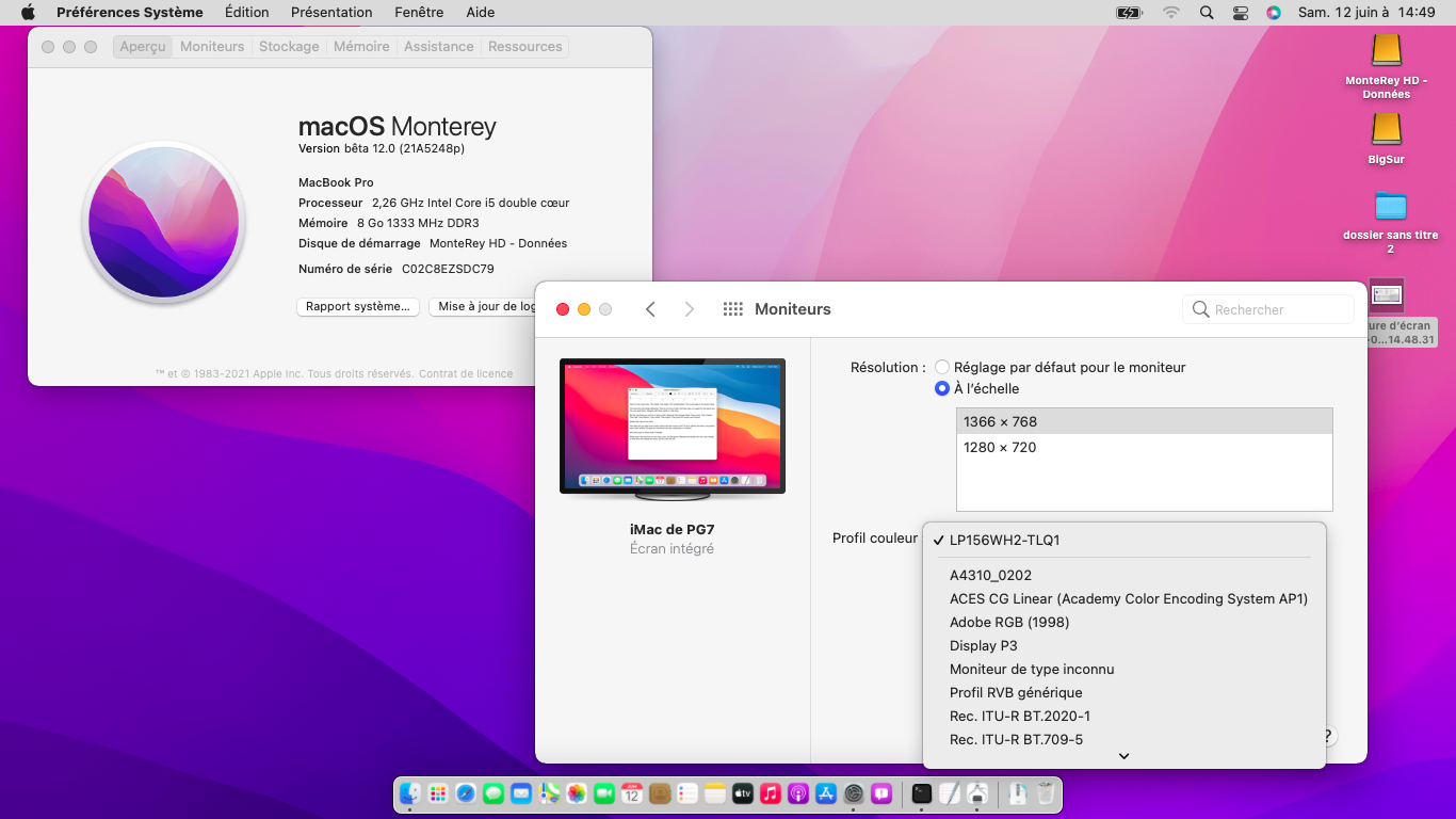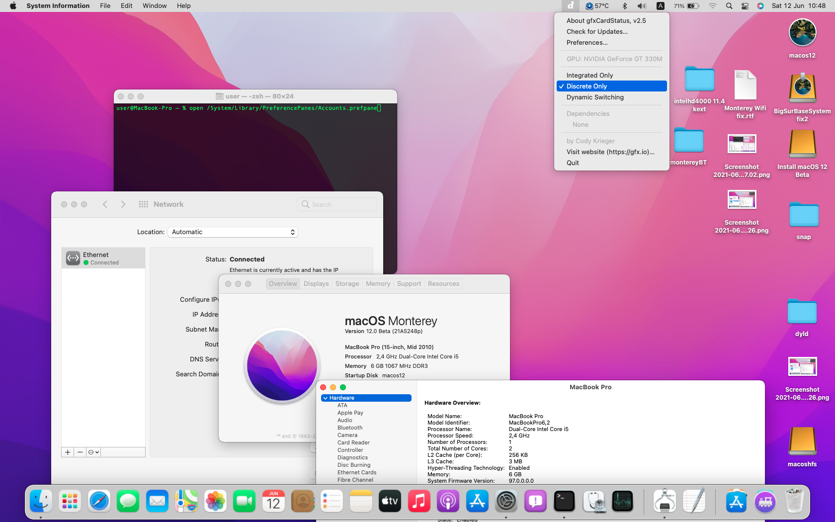 Here is another test on MacBookPro6,2 dualnonmetalGPUs in booting Monterey, without acceleration of course and without Wifi , this is made possible again thanks to @ASentientBot who found the workaround to set "auto login", because the multiuser loginwindow crash without Metal, but applying this is not so simple because you need to complete the apple setup assistant that is very slow, then after the login loop, remove the .AppleSetupDone then reboot to setup assistant from there using a keyboard shortcut key (discussed on discord) to change the login options (setting a blank password won't work properly), more easier if you can boot from a Metal Mac and set the admin user with "auto login".