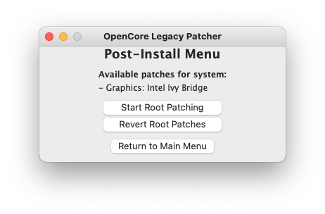 Anyway, I downloaded the GUI patcher and hit "Post Install Root Patch". However, that one says "No patches found". Do I need to first un-apply the patches (I don't think I ever applied any in the first place, but I'm not entirely sure)? Do I need to re-build OpenCore?