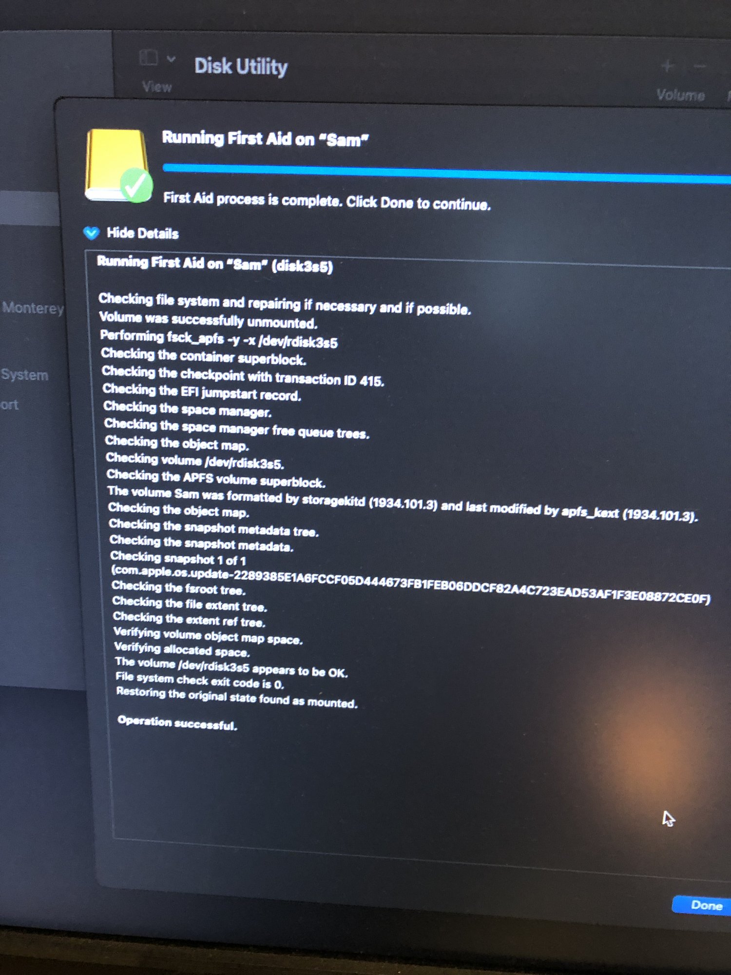 The more general known fact that the Disk utility on Monterey can not repair APFS Container disks as of yet,