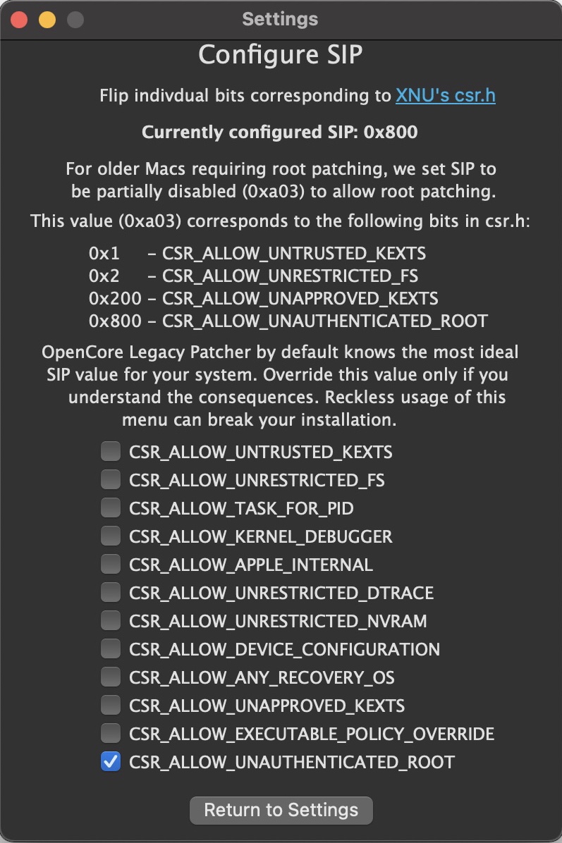 … where it is suggested, in order to enable SIP as much as possible after root patching, to only disable the “autenticated root”, thus leaving SIP almost completely enabled - and, well… it worked! So, I reconfigured SIP in this way, on my already root patched MacBookPro11,3: