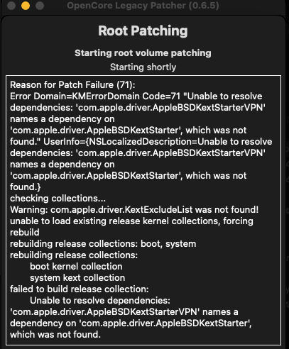 I had a similar case, solved by:I just installed OCLP 0.6.5 On a 2008 mac pro running Monterey. i tried installing root patch but it gives me this failure message, " FAIL TO BUILD RELEASE COLLECTION: UNABLE TO RESOLVE DEPENDENCIES: 'COM.APPLE.DRIVER.USB.APPLEUSBHOSTPLATFORMPROPERTIES' NAMES A DEPENDENCY ON 'COM.APPLE.DRIVER.APPLEUSBHOSTMERGEPROPERTIES; WHICH WAS NOT FOUND. PLEASE REBOOT THE MACHINE TO AVOID POTENTIAL ISSUES RERUNNING THE PATCHER. your help would be greatly appreciated in resolving that issue.