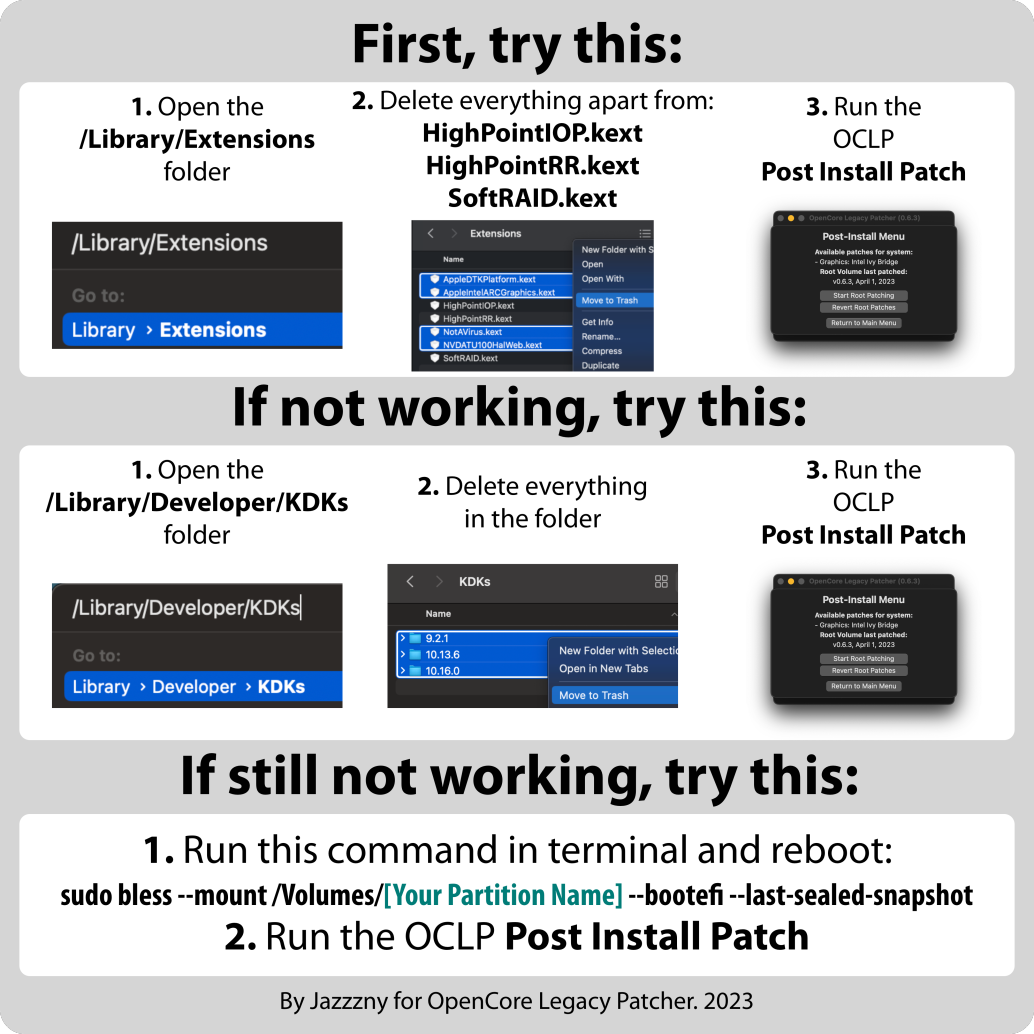 Thank you for posting this. I've reported issues with post-install patching in the Ventura thread and this is the first I'm seeing these recommendations. Prior to seeing this, I first attempted "Revert Root Patches" (OCLP > Post Install Root Patch > Revert Root Patches) and if that didn't work, I performed a clean macOS install to a new APFS Volume and then Migrated my data/apps from the old volume.
