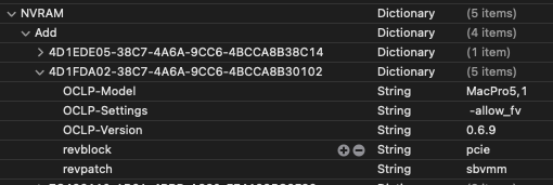EDIT2: The EFI generated by OCLP 0.6.9 for MP5,1 does include revpatch = sbvmm.