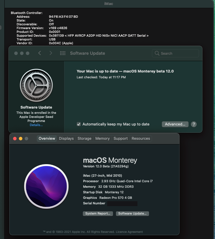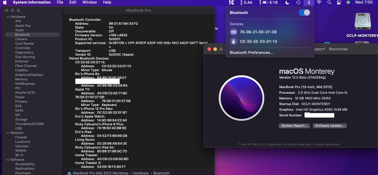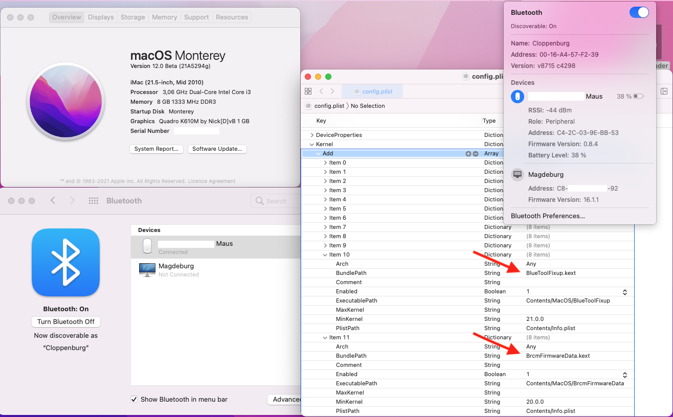 The latebloom.kext thread and this forum are both currently attracting many posts about BT problems. My upgraded 'internal' Wifi/BT4.2 card (BCM943602CDP) also stopped working with Monterey. Member kronokernel says we need to force the OS to use the EHCI controller for BT, rather than the increasingly-unstable OHCI controller, by using a separate USB hub or PCIe riser card [as an intermediary].