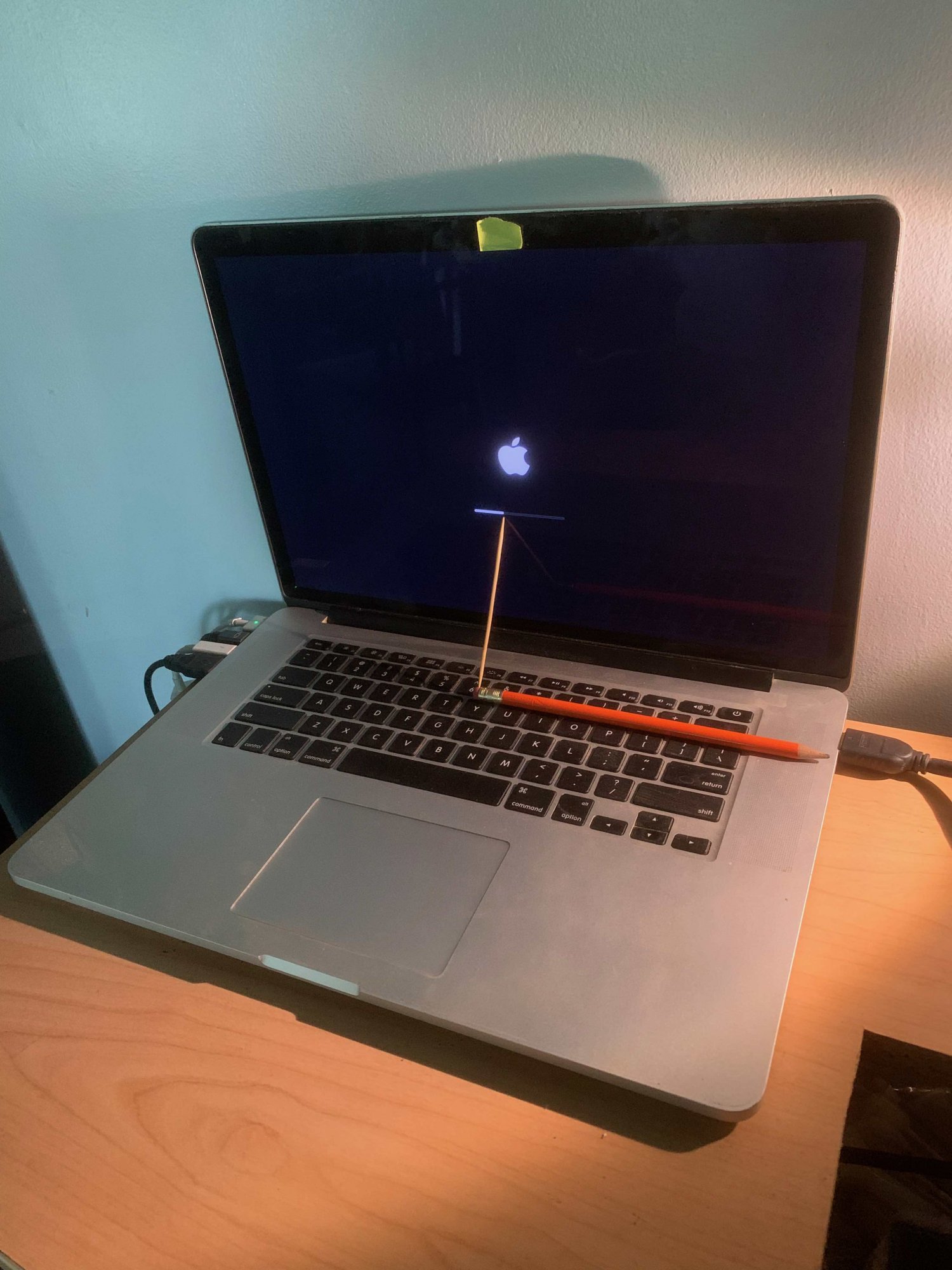 Boot went OK for a little while then stopped. "Maybe it's running slowly or doing a backup" I thought. 45 mins elapsed so I deployed my "MacOS Boot Stall-O-Meter" ™ (a cocktail stick stuck into a pencil eraser, see attachment). I came back an hour later and the progress bar hadn't moved. Forced a power-off and restarted. Same thing, same place (I'd left the pointer in place so I know).