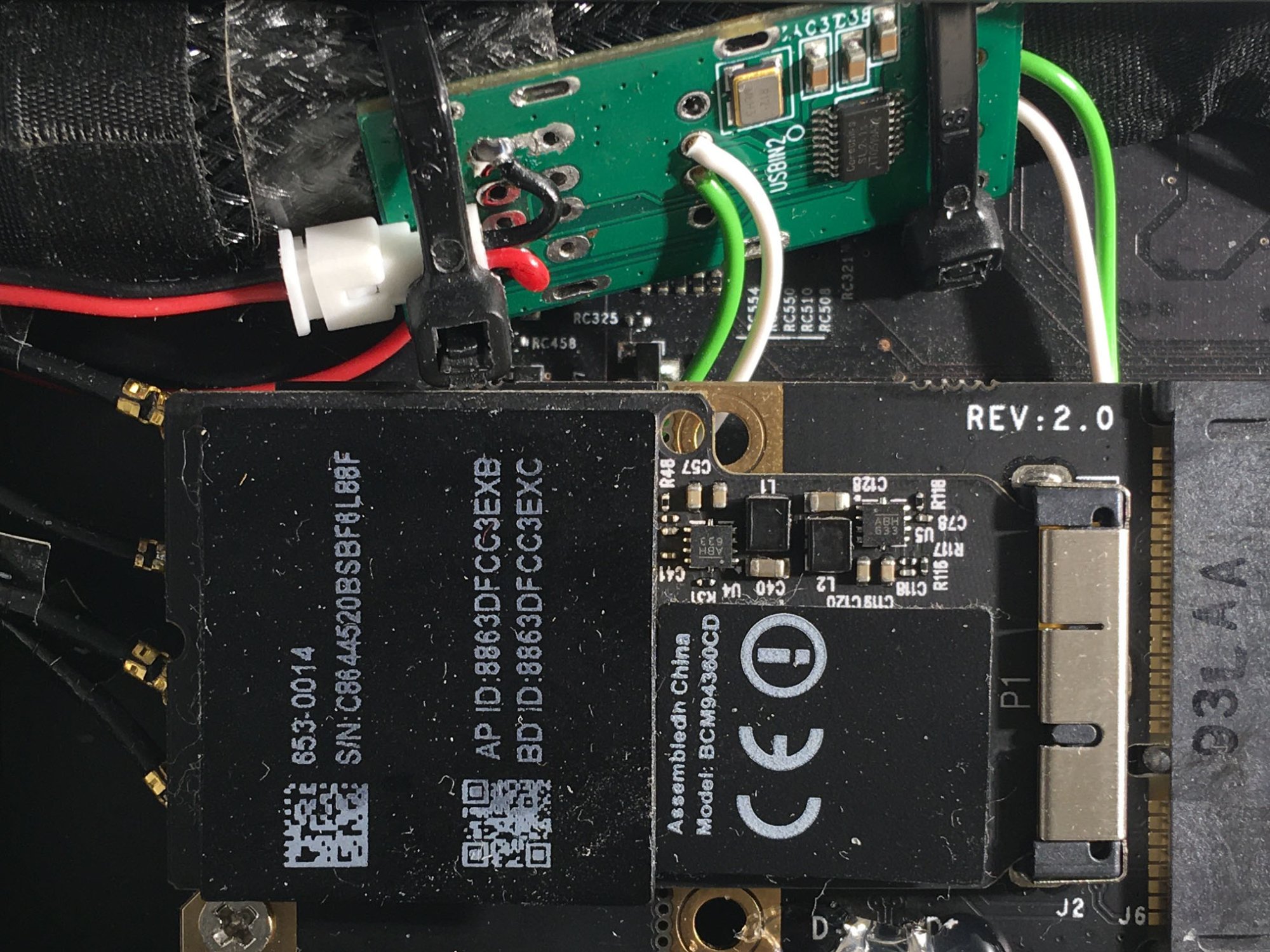 The USB data, D+ (green wire) and D- (white wire) from the output of the hub card connect to the JST GH 1.25mm socket of the old Bluetooth card.