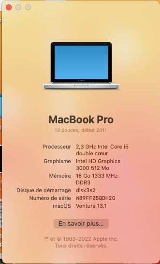 Congratulation on getting your MacBooK Pro 5,2 running Ventura.
