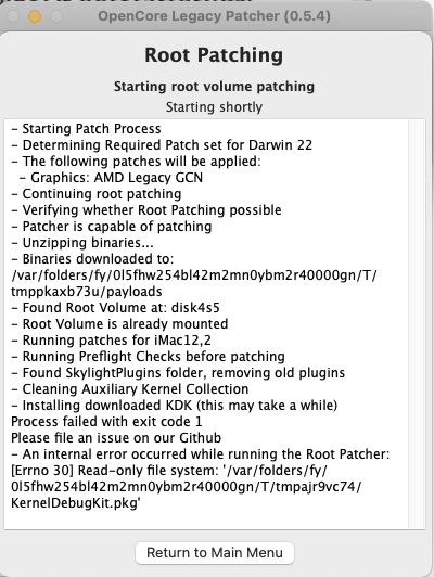 I had to use OCLP 0.5.2 to post-install patch after the 13.2b2 update. For me, 0.5.3 and any 0.5.4n showed 'No patches available/necessary', even though I needed the patch to get my old AMD graphics card to provide UI acceleration and multiple monitor support. Although I already had KDK 13.1_22C65 installed in my Developer folder, 0.5.2 deleted this and downloaded the files again to 'var/temp' during the patch process.I upgraded my 2011 27" M5100 iMac from 13.2b1 to 13.2b2 yesterday and applied the post-install patch without issue. The b2 has some issues so I decided to delete the KDKs folder and redo the patch today. Unfortunately it gave the same error as someone else has mentioned only a few posts back.