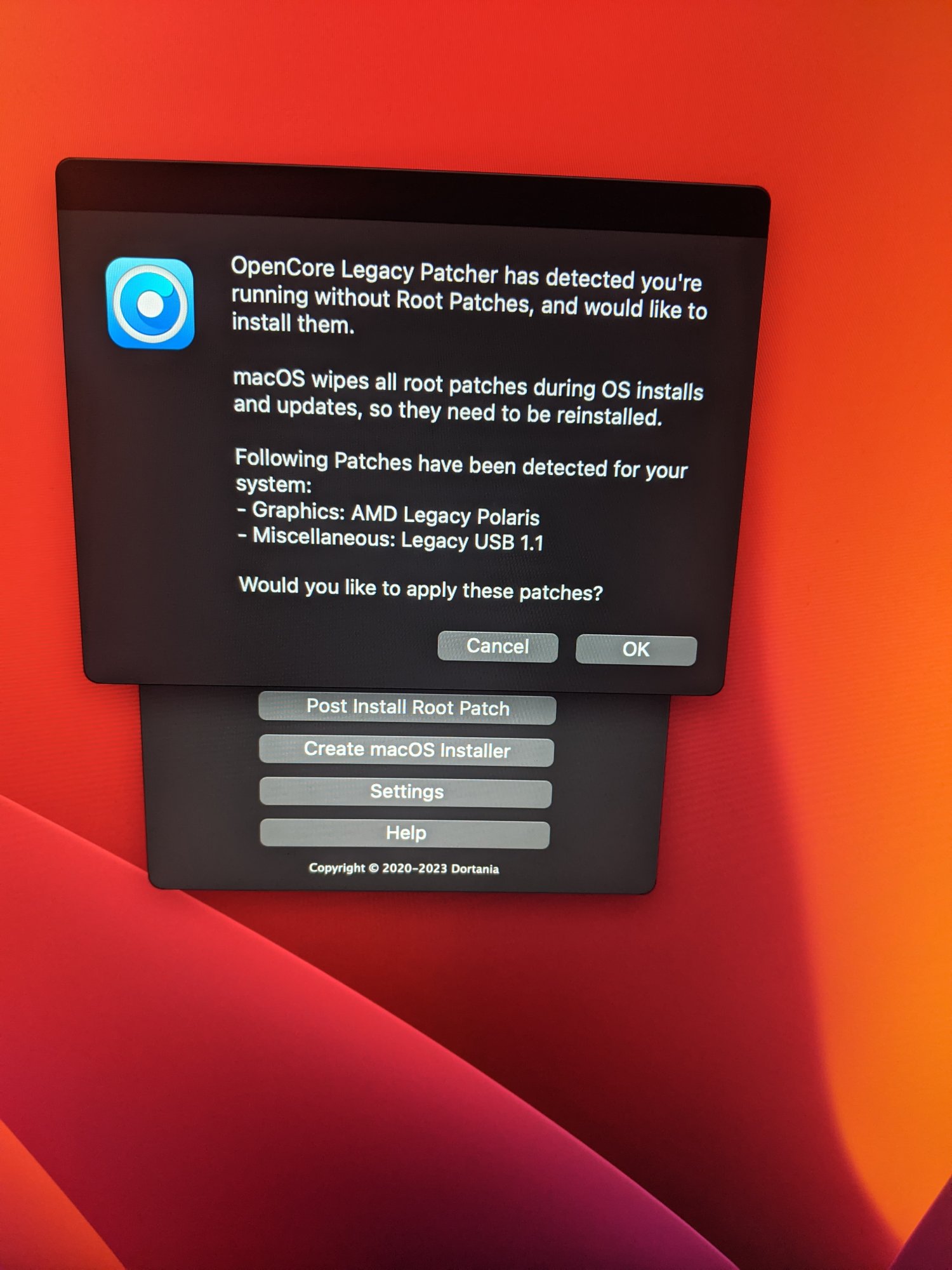 Once I got back into my Ventura install OCLP asked me to apply Polaris Patches and USB 1.1 patches, (that's the 4th picture). [ This will require an active internet connection as OCLP will have to download the patches ]. I clicked ok and OCLP downloaded and applied the patches. And then I restarted.