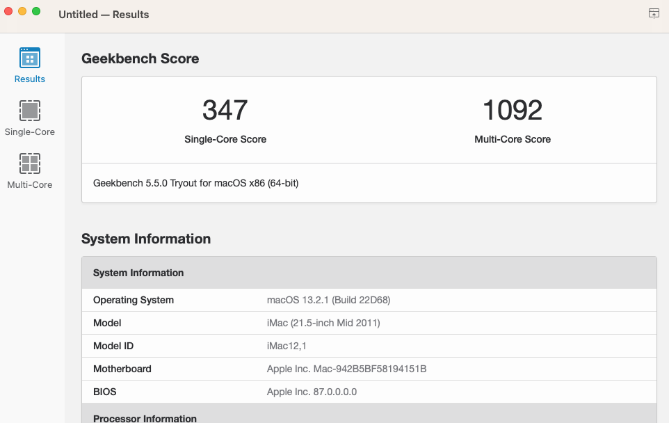 hello... how is it possible that on iMac 21" 2011 i5 2.7 ghz with nvidia quadro k1000 2GB and mac OS 13.2 there is such a performance degradation (multicore in particular) with GeekBench 5 and 6 against a score of about 1900 as highlighted in the Mactracker app? surely due to the AVX 2 graphics acceleration in the CPU not present? or something else?
