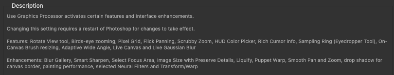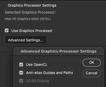 Interesting info, thanks! I'm not sure if it applies to my setup (2013 MBA, 13.2.1 w/Intel 5000), but below are what the settings in PS look like in the latest version and a link to Adobe Help on the matter.