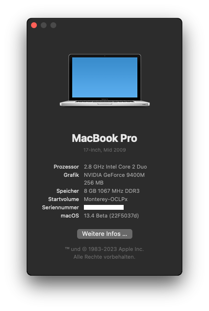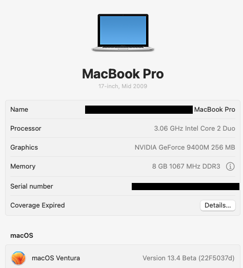 MacBook Pro 5,2 (Mid 2009). (Successful recovery and Ventura 13.4 beta2 installation)