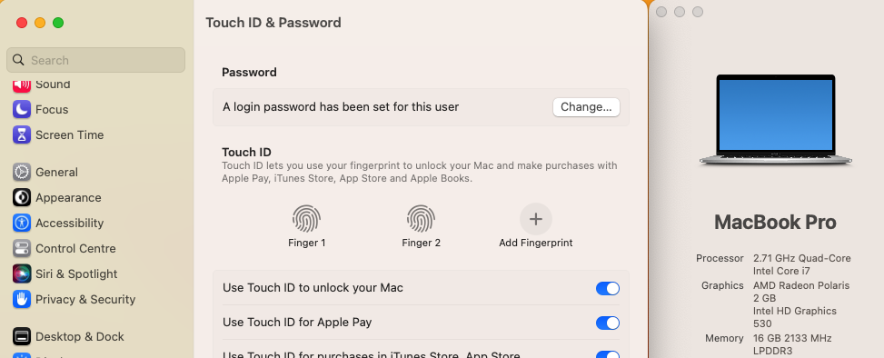 My macbook pro 15inch 2016 after install Ventura , i can’t setup TouchID