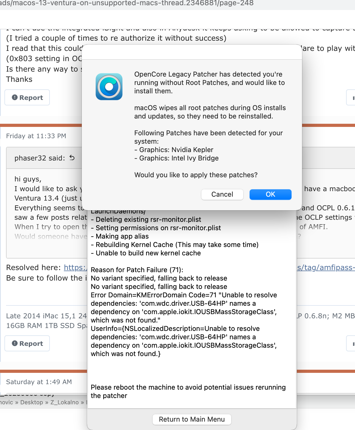 Thx for respond! Yes I have 0.67 and when try to install get error from picture. Oclp push me message to post install root patches but result is unable to build new kernel cache. I'm stuck here...I have the same mid 2012 rMBP10,1 and it's working great with 13.4 + OCLP 6.7. Make sure you're on OCLP 6.7, if not, install it. Did you apply the OCLP post install patches that includes the ones for Kepler and HD4000?