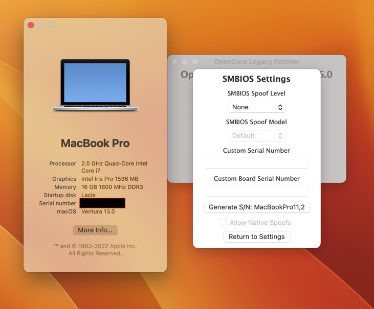- Boot from USB.Key_Spoof14,1 into Ventura partition