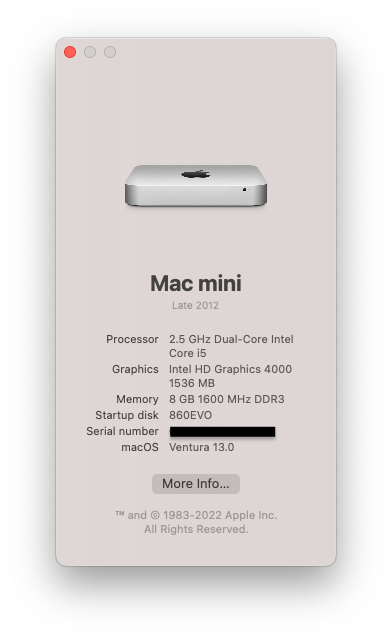 Ventura runs great on 2013 MacBookAir6,2. So I went ahead and installed it on 2012 Macmini6,1.
