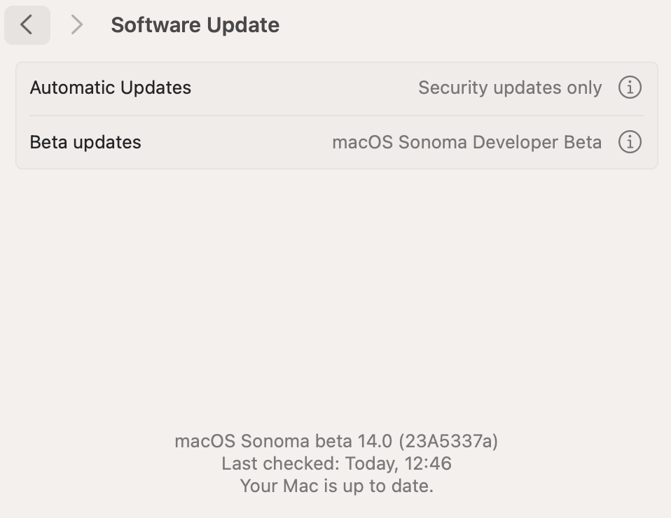 Not true. My 15" MBA isn't seeing the update.Yeah, looks like it's an issue with pro or higher chips. My M2 Pro Mac mini is not seeing it either. Plus, right around the release of the RC, a fun new behavior developed where the animated screensaver/wallpaper combos started crashing WindowServer every time I woke the machine. To this point, Sonoma has been solid -- not even a kernel panic.