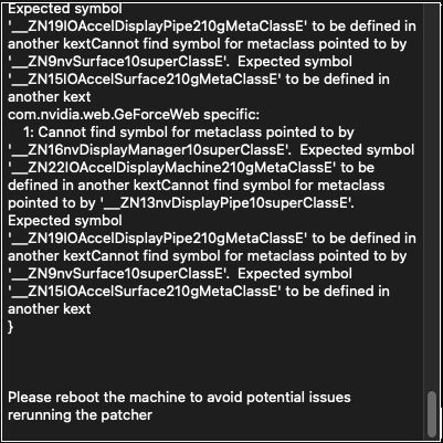 Cannot find symbol for metaclass pointed to by ‘__ZN9nvSurface10superClassE’. Expected symbol ‘__ZN15IOAccelSurface210gMetaClassE’ to be defined in another kext com.nvidia.web.GeForceWeb specific: