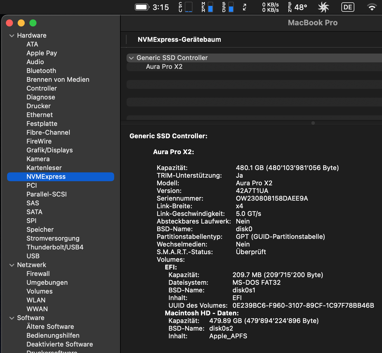 MBP11,1: running from new internal SSD (OWC Aura Pro X2 480 GB).