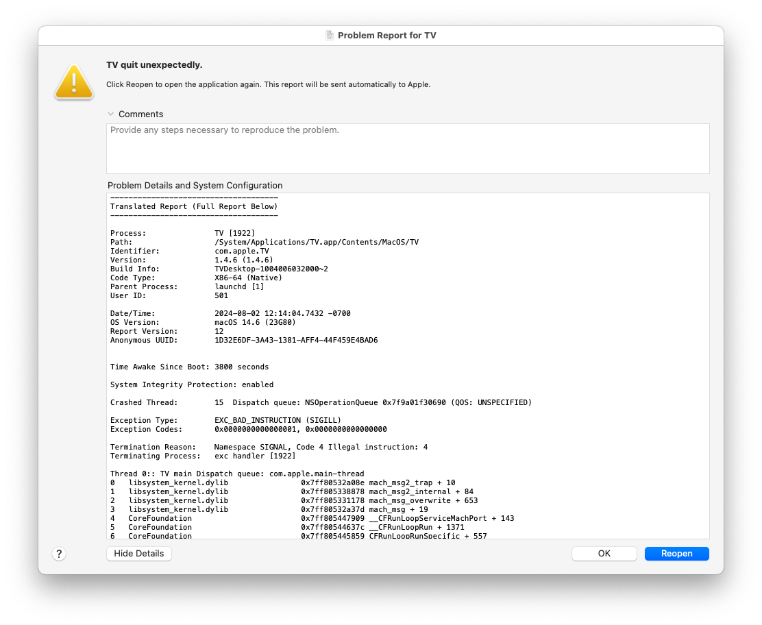 Sonoma 14.5 on OCLP 1.4.3 was actually very unstable for me: frequent kernel panics. 14.6 on OCLP 1.5 seems a lot better, in every respect but one: the TV app. I'm getting a crash when I click on any of the options in the Library. As I say, this is connected to my TV, so in many ways it is what the Mac is for… The beginning of the error is also screenshot. I've deleted the preferences and started again with a new library. With new preferences, the Apple TV and TV+ options are fine. It's the Library options that cause a near-immediate crash. I thought maybe one file might be corrupted, so removed all the contents, with the idea to add them back one time. It doesn't matter: it still crashes, even with an empty library. Interestingly, even going to home sharing to the Mac mini M1 (with the idea to reimport) also causes an immediate crash. I try to keep the Mac mini M1 file for-file-identical, including not running beta software on it so I could restore from its backup to the Mac mini late 2012. Its TV.app is working perfectly, with the same files. (incidentally, almost all are old or very old BBC shows or other video I've edited or clipped up: it's not some wrong-side-of-the-tracks .mkv! No judgment: I'm just saying I don't think this is virus or malware related, for troubleshooting purposes.)