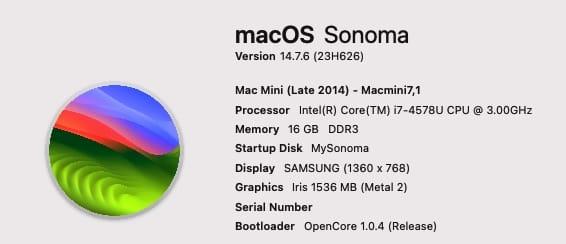 I have a Late 2012 Mac mini (quad-core Core i7) and Sonoma 14.7.4 seems to run pretty well on it. I’m using an external Thunderbolt 1 SSD as my boot volume. No obvious glitches while running, I have had issues where the external SSD was not ‘seen’ at boot time, and some graphics issues that were mostly addressed by the root patches in OCLP 2.3.2.