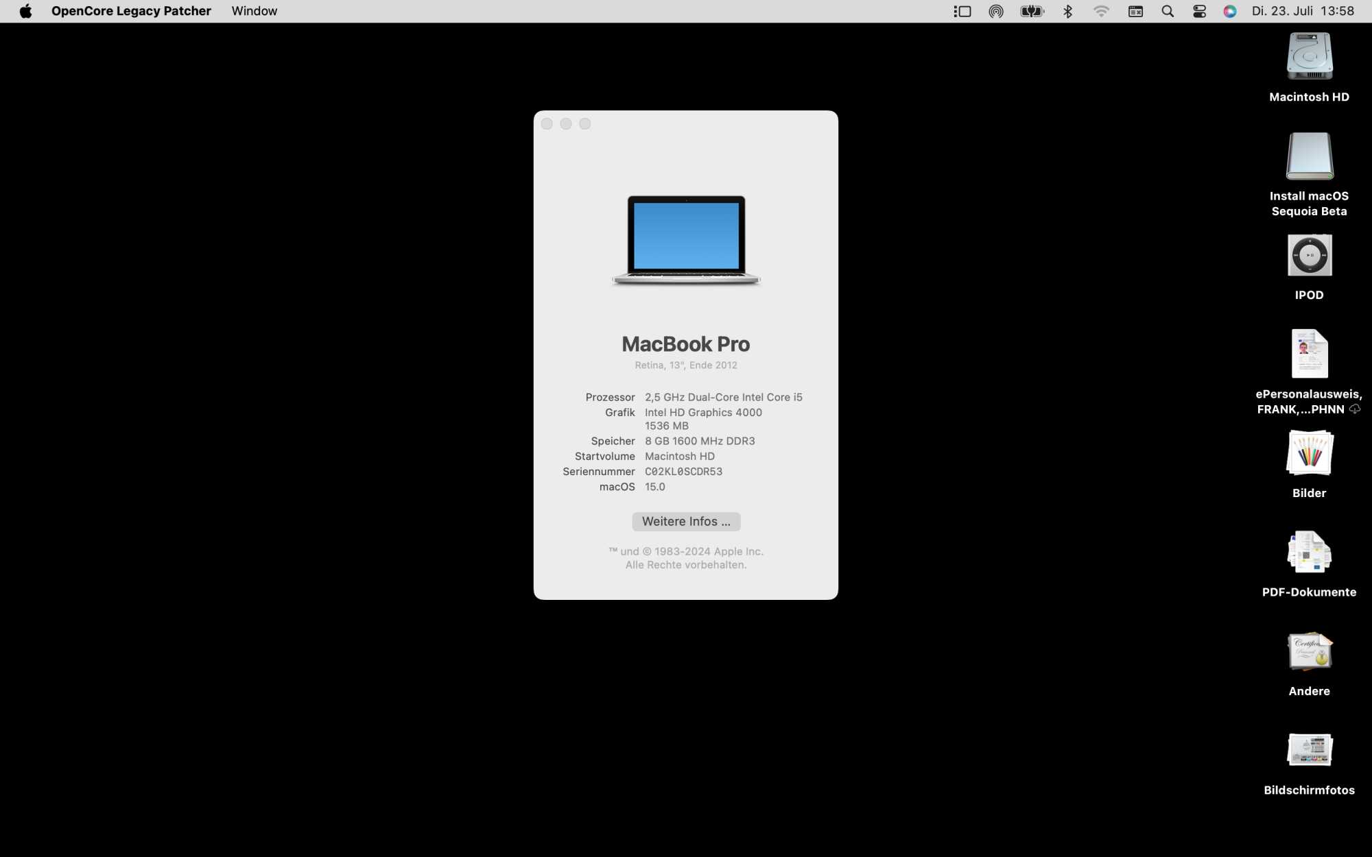 MBP11,1: 15.0b3v2 (24A5289h) from full installer, on external SSD. OCLP sequoia-development branch (12 July) from source for EFI and partial root patch with some manual steps for root patching (spoiler). No full graphics acceleration but usable, wifi ok. Photos working, Preview crashing. Can't set resolution to a more usable (smaller) value.On Discord, there’s also a preview of a 3802-based (Intel and Nvidia) Sequoia-patched machine, with fully accelerated graphics: the future looks good, indeed…