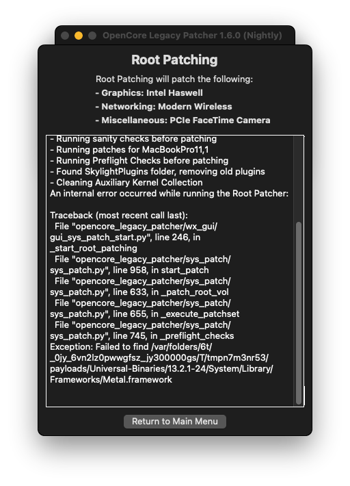 Just as a side note, the original Sequoia installation (see post #228) became corrupted, hence, new installation from scratch on the internal drive. The OCLP 1.6n did not allow installation of Sequoia, so downloaded source code and build components; transferring