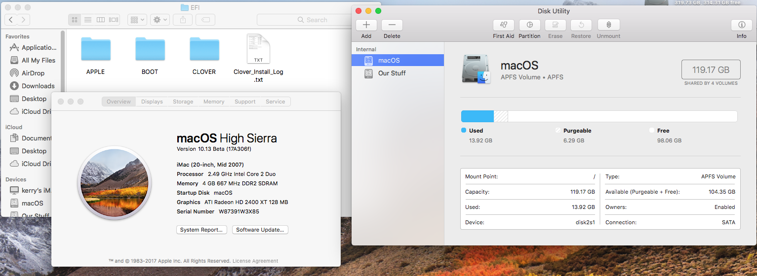 I launched Dosdue’s post-install patch, by double clicking on its icon, and followed the instructions, choosing appropriate modification for my machine. Rebooted again, with option key on to get boot choices, selected main drive with High Sierra Beta3 installed and ... I was greeted with standard installation messages and process completed without a hitch.