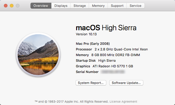 I have successfully updated my Mac Pro 3,1 (Early 2008 8-core 2.8, ATI Radeon 5770) to High Sierra. My first attempt using APFS on a 3rd party SSD didn't work, but with HFS+ it went smoothly. The only issue I have noticed so far is that if I switch apps to full screen, the desktop goes bright red before it is obscured, and it does the same as apps come out of full screen, only returning to the desktop image once the process is complete. It doesn't go red with minimise or any other screen movement. Other than this small anomaly, all seems well.View attachment 721401