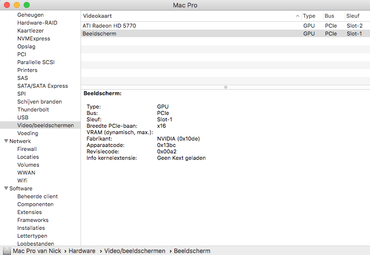 PS: the photo I attached is in Dutch, but Beeldscherm means Display and Geen kext geladen = No kext loaded.
