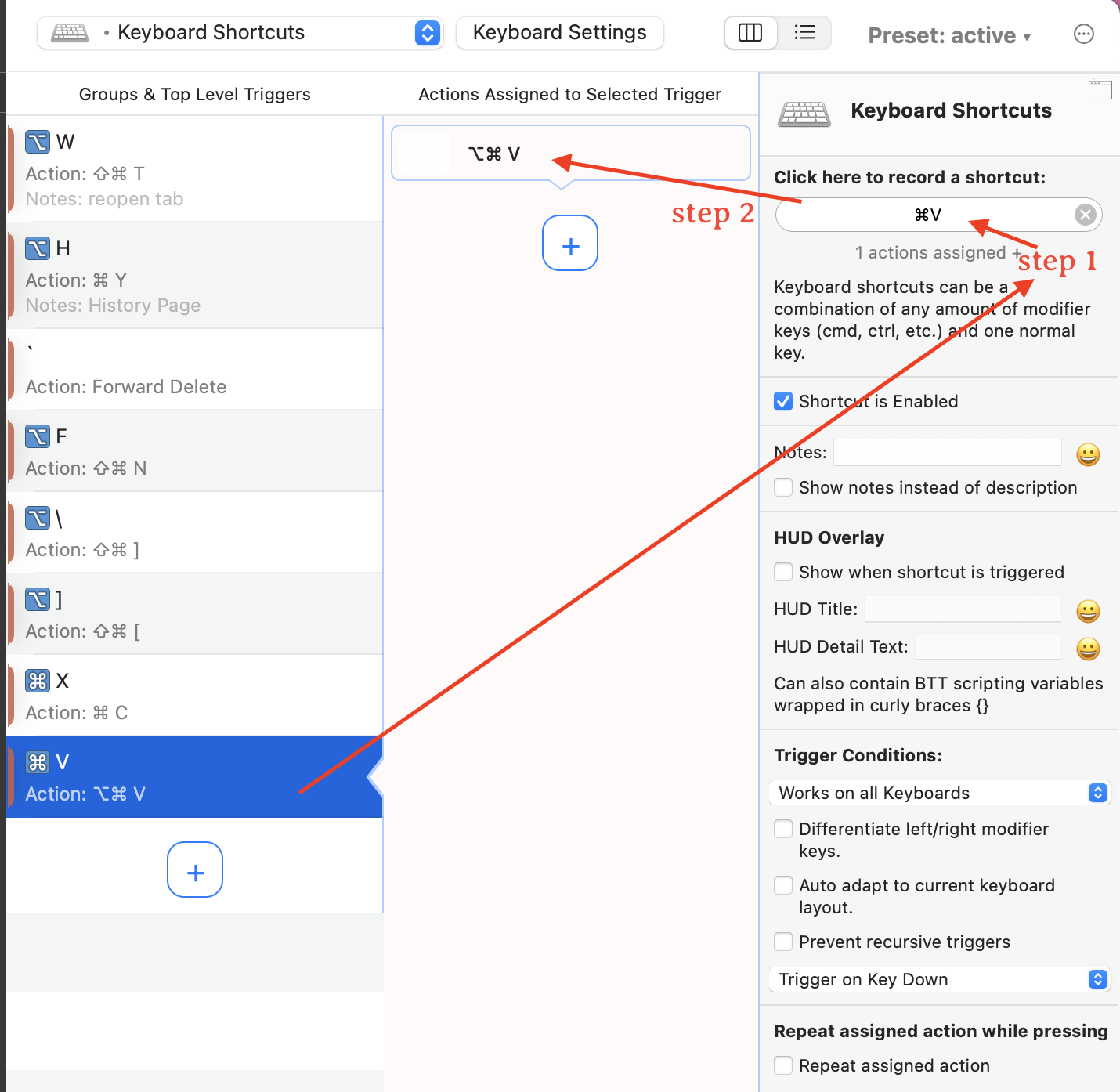 - remap CMD keyboard input CMD-V to CMD-Option-V (BTT app shows it as option-cmd-v but it doesnt matter)